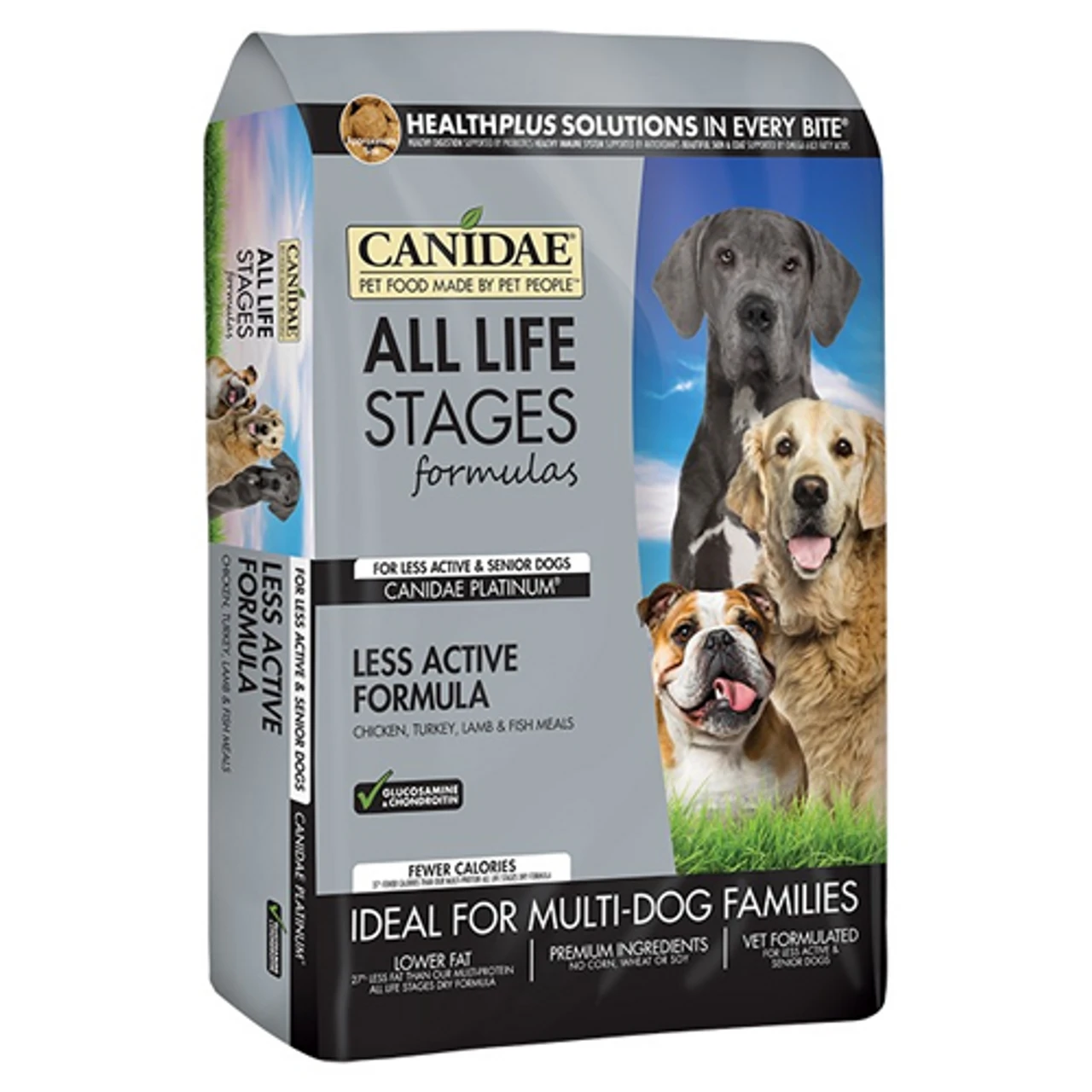 Our CANIDAE® All Life Stages Platinum Less Active Dog Dry Food Multi-Protein Formula is specifically formulated for your dog at any life stage, for any breed, or any size. This makes mealtimes with multiple pets much easier with just one bag for all dogs!