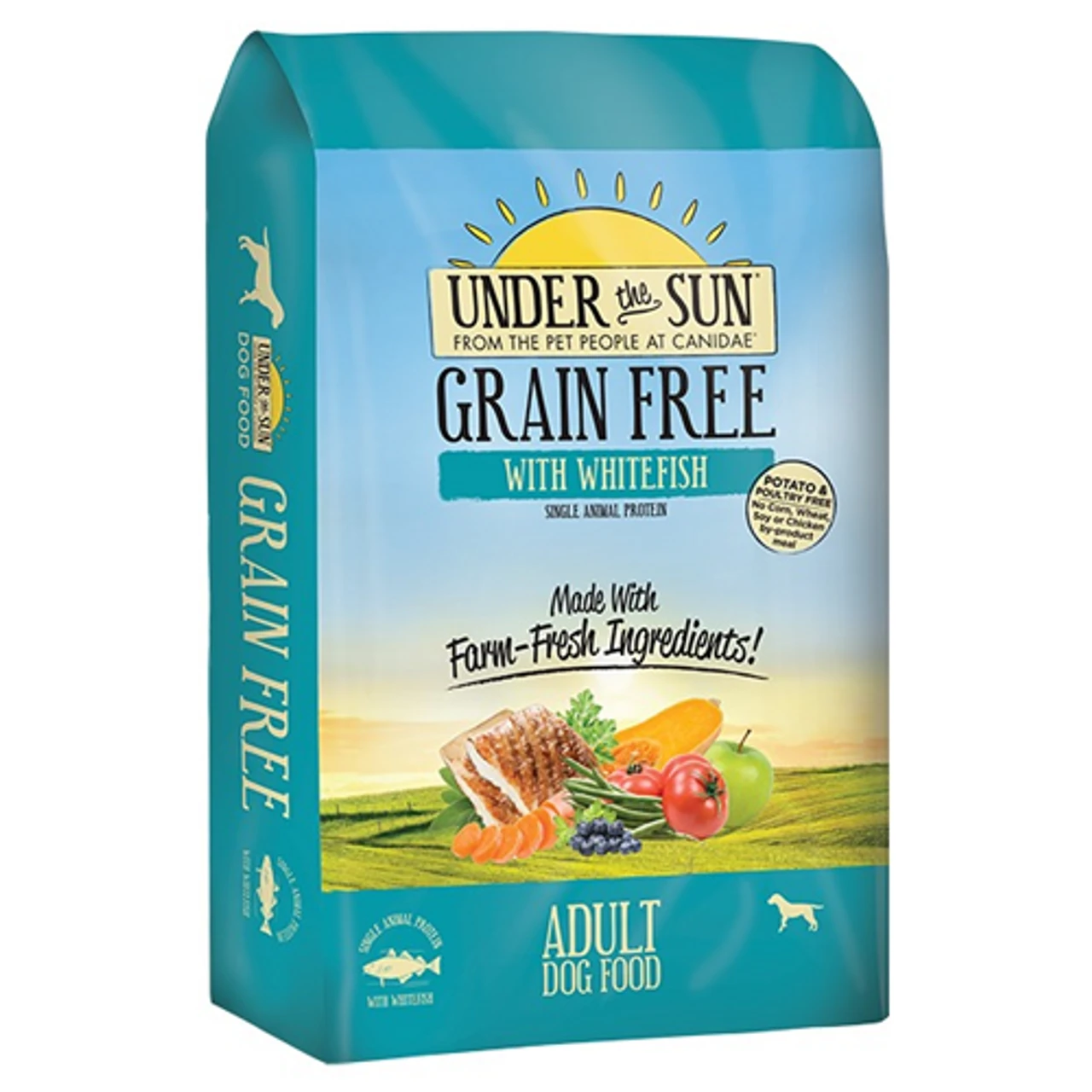If your dog experiences food sensitivities, choosing a single animal protein like our whitefish formula can help. Our CANIDAE® Under The Sun® Grain Free Adult Dog Food With Whitefish is made with high protein whitefish meal for great taste your dog will love. Whitefish is the single animal protein used in this dog food recipe. We also use a variety of farm-grown fruits & veggies like apples and pumpkin. Our dog food recipes never use corn, wheat, soy, or chicken by-product meal. Reward your loyal companion with great tasting grain free nutrition!