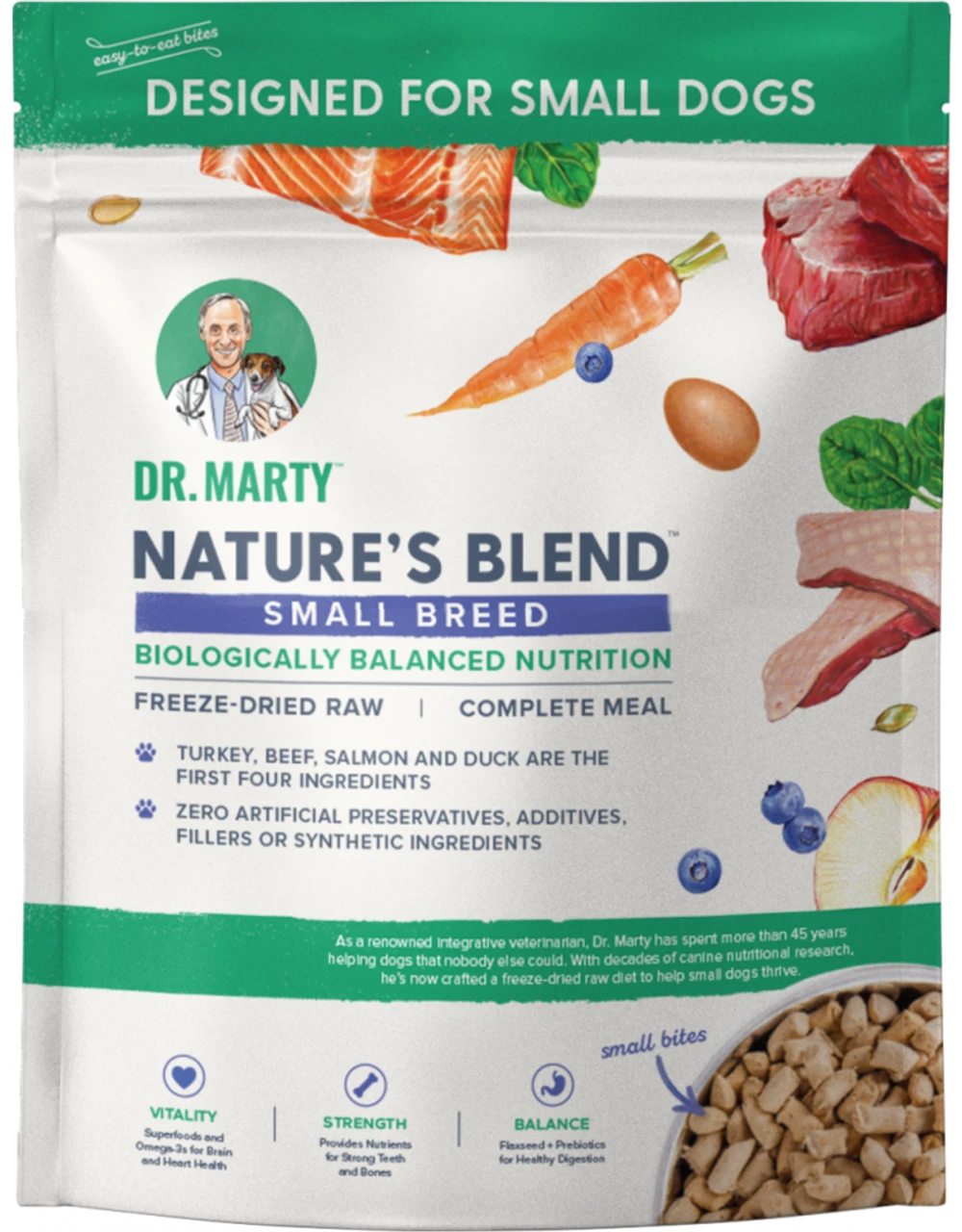 Turkey, Beef, Salmon, Duck, Beef Liver, Turkey Liver, Turkey Heart, Flaxseed, Sweet Potato, Egg, Pea Flour, Apple, Blueberry, Carrot, Cranberry, Pumpkin Seed, Spinach, Dried Kelp, Ginger, Salt, Sunflower Seed, Broccoli, Kale, Mixed Tocopherols (natural preservative)