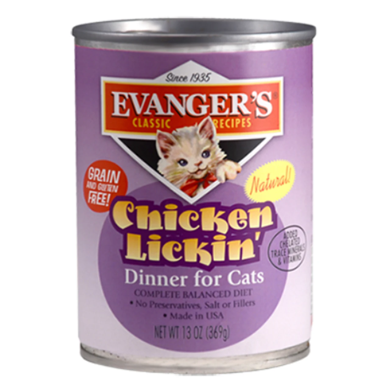 Evanger’s Chicken Lickin’ Dinner is formulated to meet the nutritional levels established by the AAFCO nutrient profiles for all life stages. Kittens, pregnant and nursing cats may require 2-3 times above amounts, and reduced for less active or older cats. Amount of food your cat requires depends on activity, age, environment and breed.