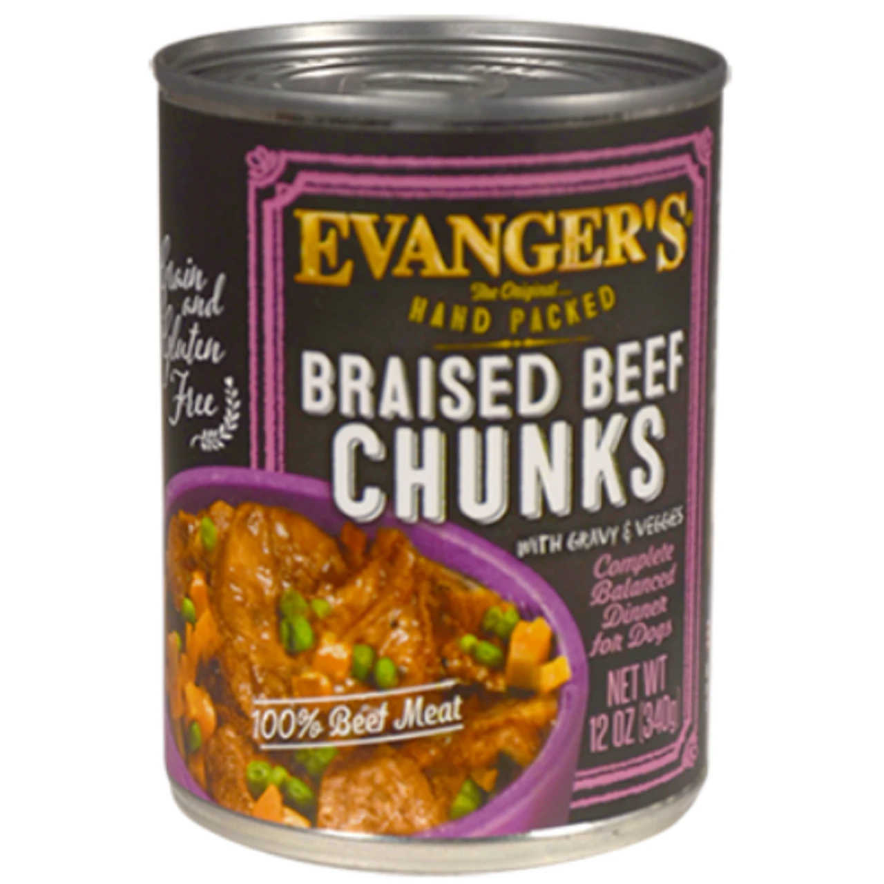 Evanger’s Braised Beef Chunks Dinner is formulated to meet the nutritional levels established by the AAFCO nutrient profiles for all life stages. Puppies, pregnant and nursing dogs may require 2-3 times above amounts, and reduced for less active or older dogs. Amount of food your dog requires depends on activity, age, environment and breed. Braised Beef is certified Kosher for Passover by the cRc.