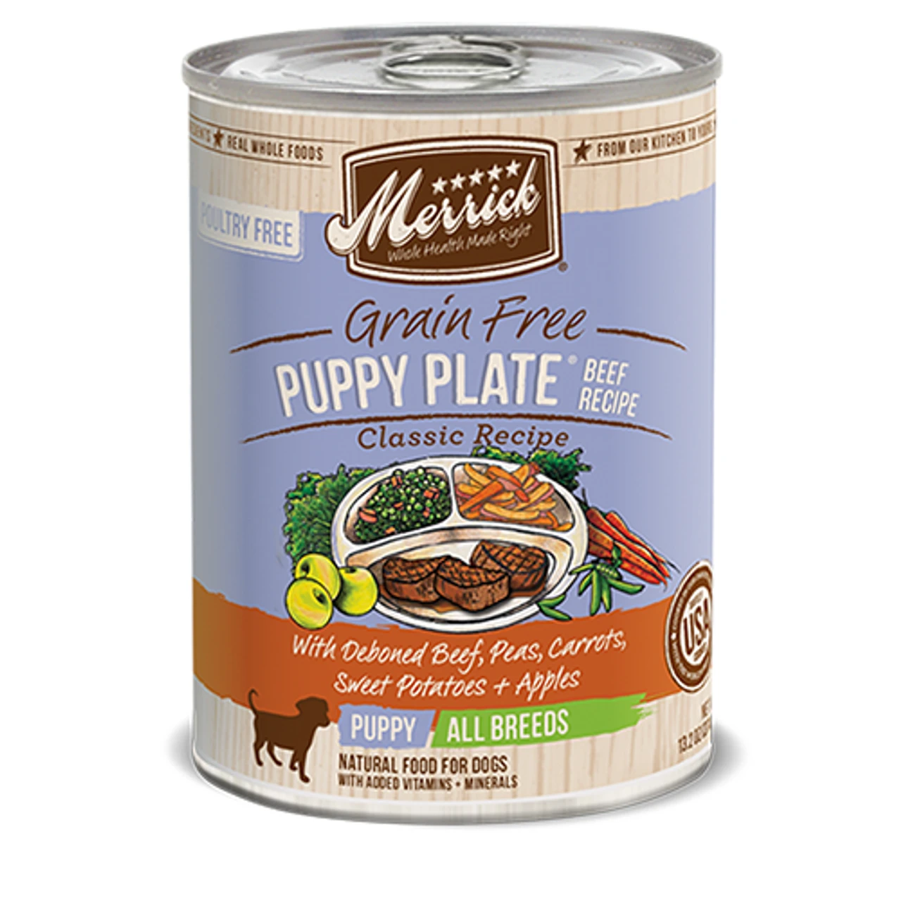 Complementing the Merrick Grain Free Real Texas Beef + Sweet Potato Recipe, Grain Free Puppy Plate Beef recipe is a canned recipe made with real deboned beef. It contains no artificial colors, flavors or preservatives. It contains delicious all natural home-style chunks that your pup will love.