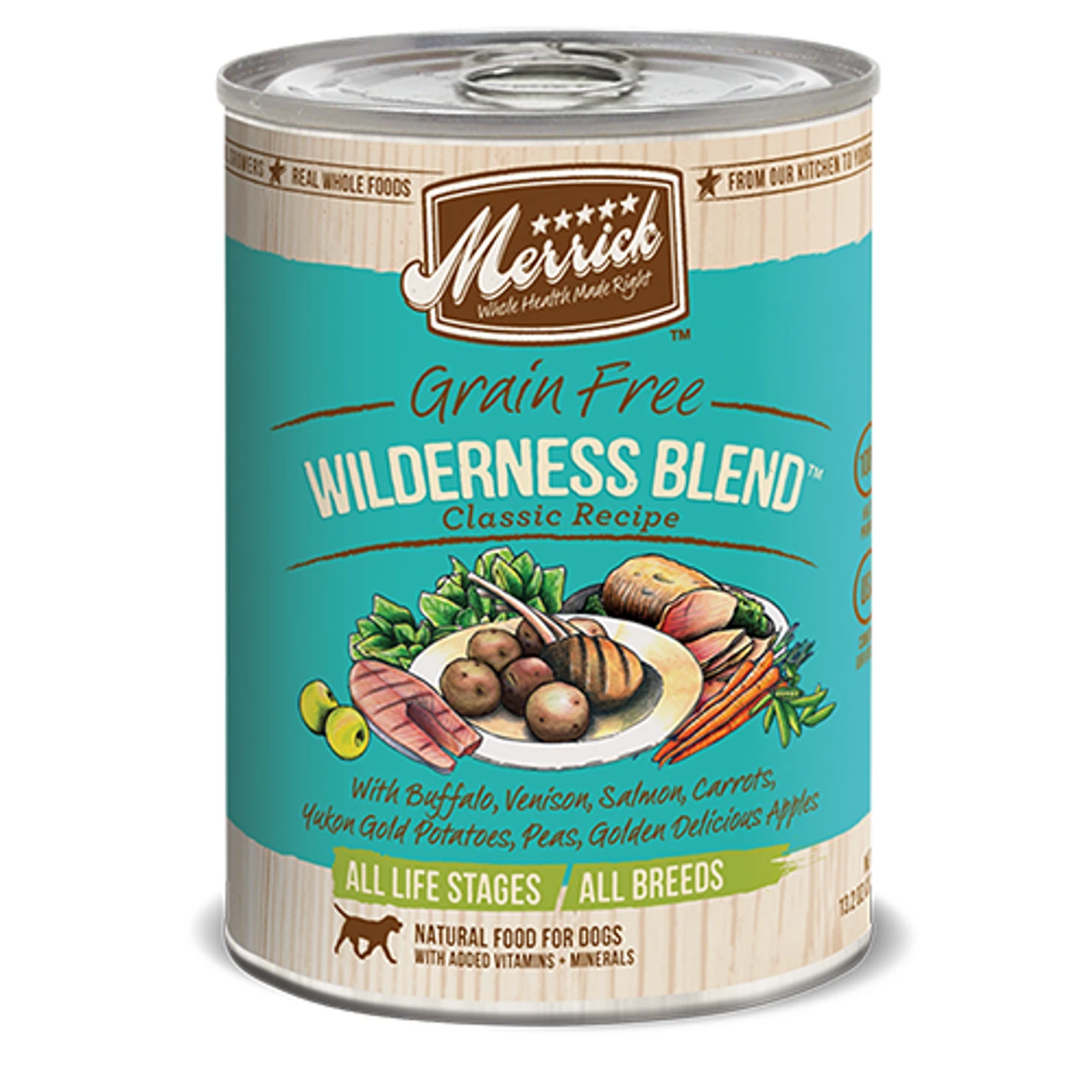 The wilderness — it is the call of the wild, the place where these flavors were first born. The bold fresh taste of salmon, the untamed taste of venison and the original flavor of buffalo all mixed together for an excursion of the palate. The unharnessed flavor of Wilderness Blend awaits. The Merrick family invites your dog to return to his first love — the wild! Merrick Classic Grain Free Wilderness Blend™ Canned Dog Food contains no artificial colors, flavors or preservatives. It contains delicious home-style chunks that your dog will love.