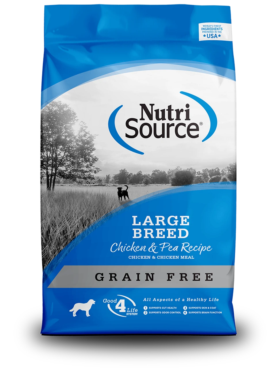 NutriSource® Grain Free Large Breed Chicken and Pea is ideal for breeds that mature at more than 50 lbs. NutriSource® Grain Free Large Breed Chicken and Pea formula delivers super premium nutrition in a holistically formulated, easy-to-digest food for balanced muscular and skeletal maintenance in large and giant breeds. Our large breed meals are created specifically for bigger dogs, utilizing adjusted levels of calcium and phosphorus matched with balanced protein, fat, low glycemic carbohydrates, and calories to fuel large breed dogs to their fullest potential. We combine humanely certified chicken, low-ash chicken meal, North American peas and carefully selected holistic ingredients to promote unparalleled health for your large breed buddy. Health of your beloved pet is our #1 priority and our unmatched use of Alltech Good 4 life supplements guarantees you won’t have any gas or runny stool issues and a healthier immune system, we guarantee it. Bio-availability is important to your pets long-term health so we created a larger-size morsel making it easier for large dots to eat with a +85% digestibility rating – Health begins here!