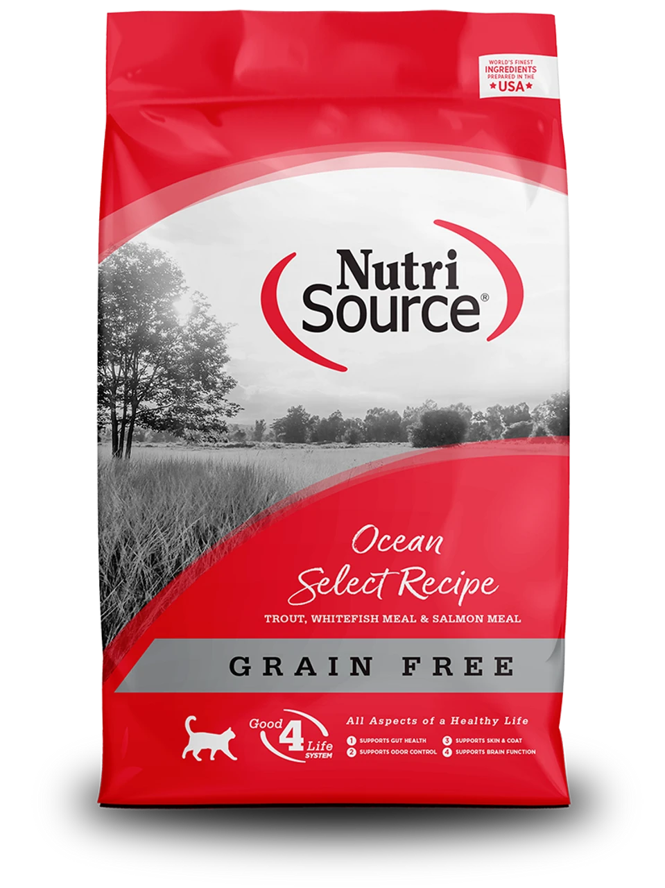 Trout, whitefish meal, peas, salmon meal, pea protein, sunflower oil (preserved with mixed tocopherols and citric acid), chickpeas, tapioca starch, natural salmon flavor, pea fiber, alfalfa meal, flax seeds, yeast extract, dried brewers yeast, dried tomato pomace, potassium chloride, salmon oil, phosphoric acid, salt, choline chloride, minerals (zinc proteinate, iron proteinate, copper proteinate, manganese proteinate, cobalt proteinate), DL methionine, cranberries, taurine, vitamins (vitamin A acetate, vitamin D3 supplement, vitamin E supplement, niacin, d-calcium pantothenate, thiamine mononitrate, riboflavin supplement, pyridoxine hydrochloride, folic acid, biotin, vitamin B12 supplement), lactic acid, dried chicory root, inositol, L-ascorbyl-2-polyphosphate (source of vitamin C), yucca schidigera extract, L-carnitine, calcium iodate, sodium selenite, rosemary extract, yeast culture (Saccharomyces cerevisiae), dried Lactobacillus acidophilus fermentation product, dried Enterococcus faecium fermentation product, dried Aspergillus niger fermentation extract, dried Trichoderma longibrachiatum fermentation extract, dried Bacillus subtilis fermentation extract.