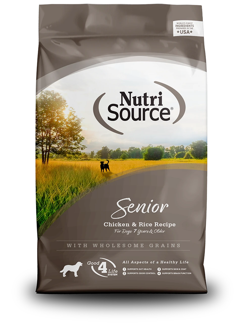NutriSource® Senior Chicken and Rice is specifically created for dogs 7 years of age and older. NutriSource® Senior Chicken and Rice formula delivers super premium nutrition in a holistically formulated, easy-to-digest food for balanced muscular and skeletal maintenance in older breeds. Our large breed meals are created specifically for senior dogs, utilizing Sel-Plex for optimal brain health, reduced inflammation! We also supplement our NutriSource® Senior formula with Chondroitin and Glucosamine for to aide in mobility. We combine low-ash chicken meal, humanely certified chicken, rice, and carefully selected holistic ingredients to promote unparalleled health for your aging best friend. Health of your beloved pet is our #1 priority and our unmatched use of Alltech Good 4 life supplements guarantees you won’t have any gas or runny stool issues and a healthier immune system, we guarantee it! Bio-availability is important to your pets long-term health so we created a highly digestible, nutrient dense morsel with +85% digestibility rating. With NutriSource® you can feed less and get more nutrition for a longer healthy life – Health begins here!