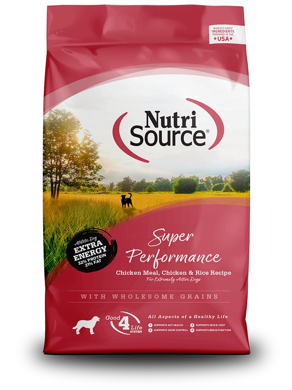 NutriSource® Super Performance Chicken and Rice formula is ideal for all breeds and all life stages. NutriSource® Super Performance Chicken and Rice formula delivers super premium nutrition in a holistically formulated, easy-to-digest food. Our Super Performance dog food is often considered the best value in any store across the nation, pound for pound when it comes to cost, quality ingredients and our unsurpassed Alltech supplements (Good4Life) – there is no equal! We combine low-ash chicken meal, humanely certified chicken, rice, and carefully selected holistic ingredients to promote balanced growth and unparalleled health for your special friend. Health of your beloved pet is our #1 priority and our unmatched use of Good 4 life supplements guarantees the new addition to your family won’t have any runny stool issues and a healthier immune system, we guarantee it. Bio-availability is important to your pets long-term health so we created a highly digestible, nutrient dense morsel with +85% digestibility rating. With NutriSource® you can feed less and get more nutrition – Health begins here!
