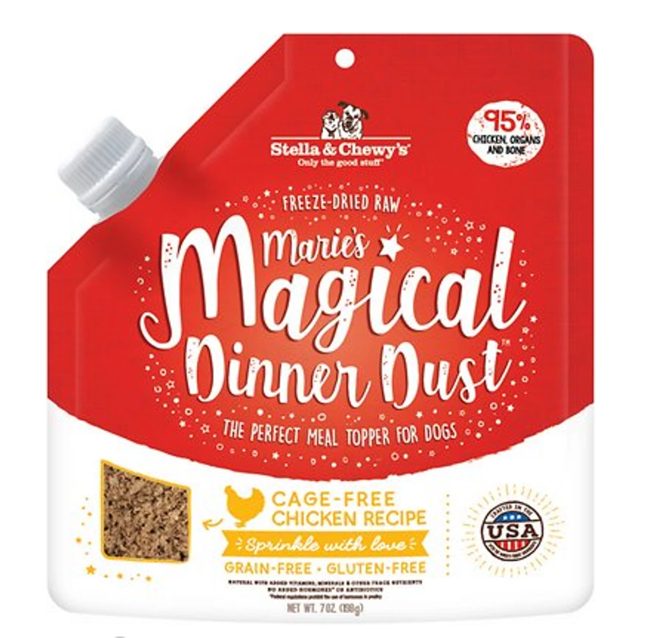 Give your paw-tner a boost of raw nutrition with Stella & Chewy’s Marie’s Magical Dinner Dust Cage-Free Chicken Dog Food Topper. This grain-free, gluten-free and freeze-dried recipe is crafted in the USA with 95% raw, cage-free chicken, organs and bone, plus organic fruits and vegetables like cranberries, spinach, broccoli, beets, carrots, blueberries and more! Simply sprinkle the topper on your canine companion’s favorite nutritionally balanced and complete meal for an extra helping of vitamins, minerals and other trace nutrients. Your furry friend will love the taste and you’ll love knowing that there are no added hormones, antibiotics or binders in this delicious Dinner Dust!