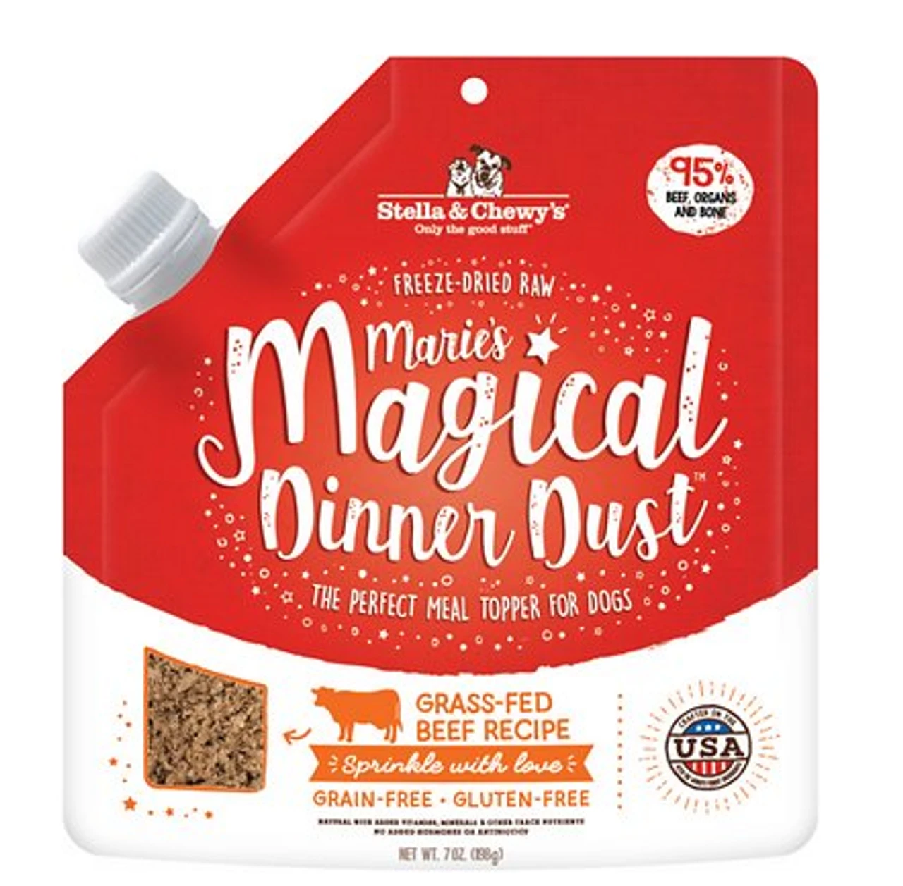 Give your paw-tner a boost of raw nutrition with Stella & Chewy’s Marie’s Magical Dinner Dust Grass-Fed Beef Dog Food Topper. This grain-free, gluten-free and freeze-dried recipe is crafted in the USA with 95% raw, grass-fed beef, organs and bone, plus organic fruits and vegetables like cranberries, spinach, broccoli, beets, carrots, blueberries and more! Simply sprinkle the topper on your canine companion’s favorite nutritionally balanced and complete meal for an extra helping of vitamins, minerals and other trace nutrients. Your furry friend will love the taste and you’ll love knowing that there are no added hormones, antibiotics or binders in this delicious Dinner Dust!