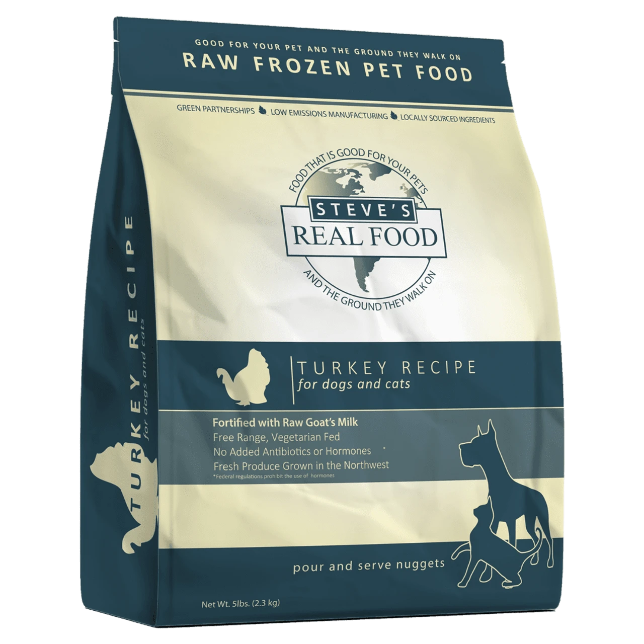 Steve’s Real Food frozen turkey diet is an easily digestible protein. It is made from vegetarian-fed, free-range turkey, complete and balanced for all stages of life, and can be fed to dogs and cats. The turkey diet is a BARF formulation composed of 80% meat/organ/bone, 15% produce, and 5% value-added ingredients such as green lipped mussel, coconut oil, and raw goat milk to provide your pet everything they need WITHOUT the use of synthetic vitamin packs.