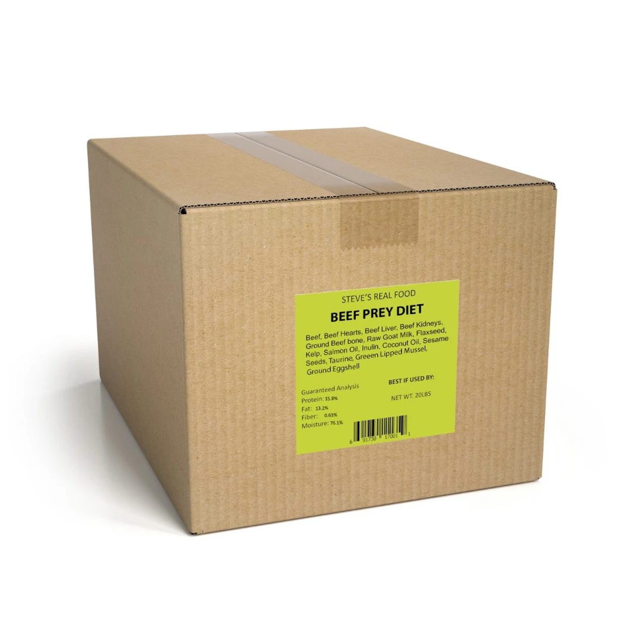 Steve’s Real Food PREY Model Raw Beef Diet is the perfect choice for pet owners who want to provide their cats and dogs with a natural, nutrient-dense protein option. The beef is free-range, grass-fed, and grass-finished. It includes 95% muscle meat, organs, and bones, with the other 5% composed of healing superfoods such as coconut oil, New Zealand Green-Lipped Mussels, and raw goat milk. The prey model diets are complete and balanced for both dogs and cats. Prey diets are ideal for an active or pregnant/lactating pet looking for a high-calorie diet. Each box contains (40) 8oz patties.