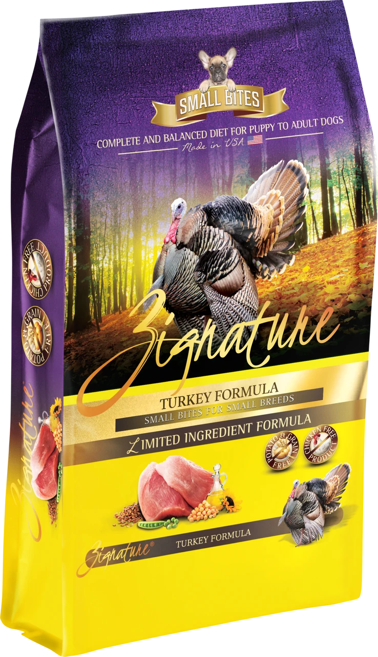 Treat your dog to the taste of real turkey with Zignature’s Turkey Formula Small Bites Dry Dog Food. This limited ingredient canine kibble is completely free of potatoes, grains, corn, soy, eggs and chicken, and features turkey from the American Midwest as the very first ingredient! You’ll also recognize other wholesome ingredients like chickpeas, flaxseed, peas and sunflower oil. This recipe is low in saturated fat, has low glycemic carbohydrates and is packed with healthy omega fatty acids and other vitamins, mineral and nutrients like selenium, riboflavin and phosphorus. And since it has zero grains or chicken, it’s a great hypoallergenic food option for dogs with allergies and sensitivities to certain ingredients.